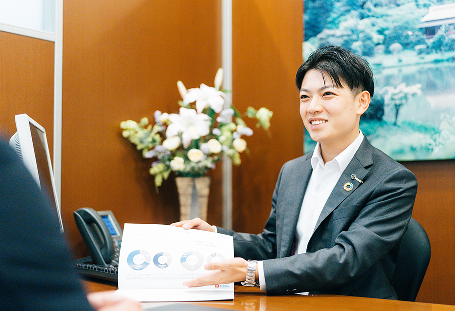 彦根支店資産コンサルタント課で、主に経営者、法人のお客様を対象に、それぞれのニーズに応じた資産価値の最大化につながるソリューションを提供しています。滋賀県は二世代、三世代が同居する方が多く、世帯当たり資産では全国で上位に入る地域です。そのため家計資産増大や相続ソリューションなどのニーズも高く、有望なマーケットだと感じています。私が担当するお客様は、事業で成功した経営者の中でも比較的年齢が若い方が多く、知識・経験の豊富な方々にご満足いただける付加価値を提供できるよう、日々勉強を重ねながら営業活動に取り組んでいます。お客様のニーズは様々で、一口に資産運用といっても安全な資産形成を必要とする方もいれば、余剰資産をハイリスク・ハイリターンで運用したい方もおられます。現在、最低賃金を上げたり、働き控えをなくす政策が打ち出されていますが、人件費をすぐには価格転嫁できない法人のお客様にとっては、営業外収益の確保が大きな経営課題となるケースもあります。他にも、将来の退職金に備えた保険商品のニーズが高い方など、多様なお客様のニーズをくみ取りながらいかに最善のソリューションを提案できるか、日々考え続けています。